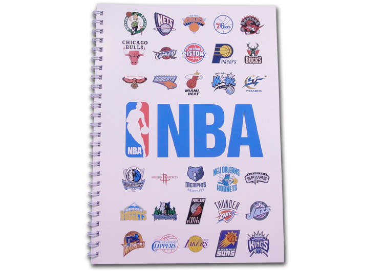 ノートの前面に、NBA参加の30チームのロゴがズラーっと並んだロゴタイプと、
